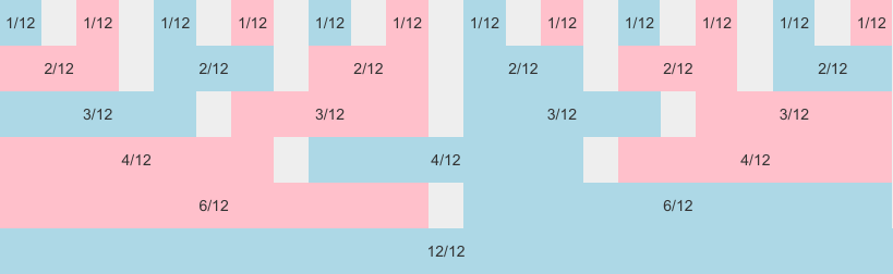 a grid with two rows, row one using a 4/4/4 division, row two a 3/3/3/3 division.